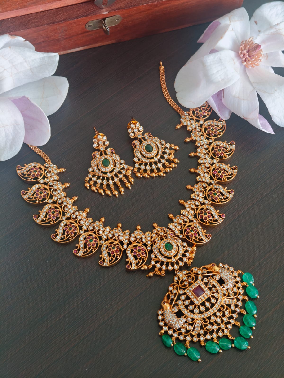 This elegant Mango Design Necklace features a classic traditional pattern inspired by timeless Indian jewelry. Adorned with sparkling Cubic Zircon stones, the mango motifs add a graceful and festive charm to the necklace. Perfect for weddings, festive occasions, and traditional functions, it beautifully complements sarees and ethnic wear.