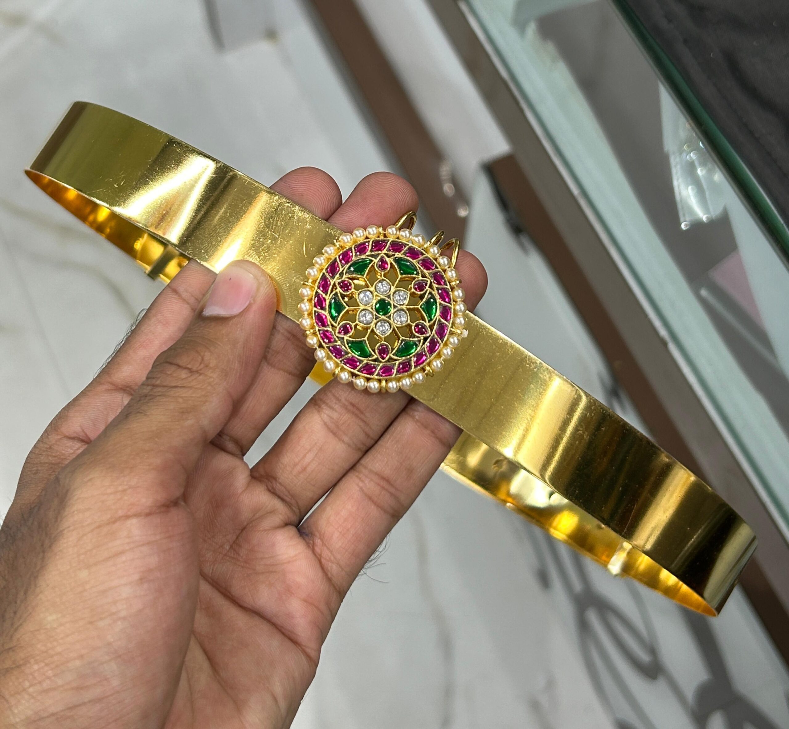Elevate your ethnic look with this beautifully designed Half Moon Pendant Hipbelt. Featuring a stunning crescent-shaped pendant, intricate detailing, and premium gold-look polish, this hipbelt adds a regal touch to sarees, bridal wear, and festive outfits. Its adjustable fit and elegant craftsmanship make it a must-have accessory for weddings and special occasions.